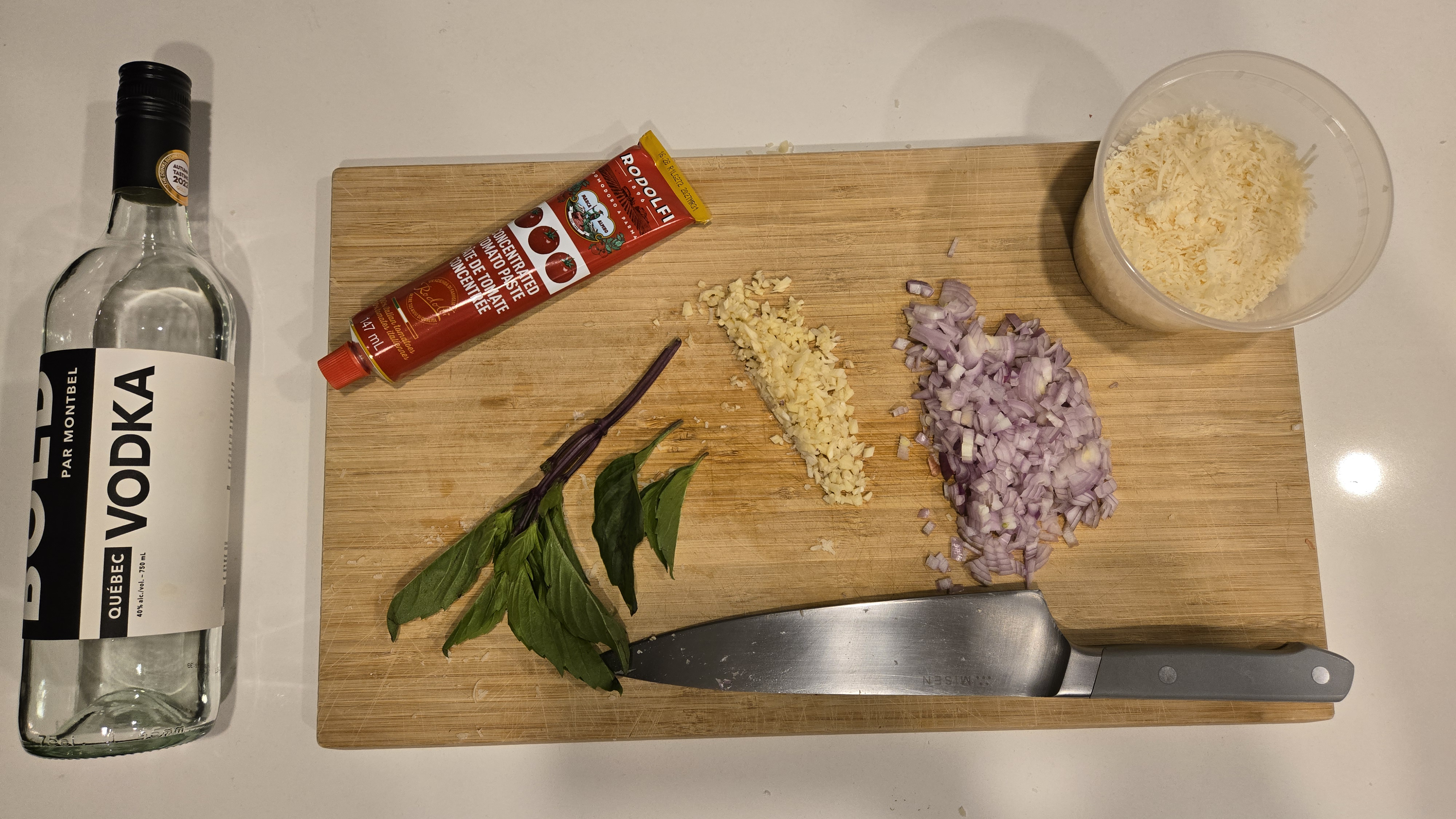 - Saute shallots and garlic in a large skillet. Add tomato paste, vodka, and cream.