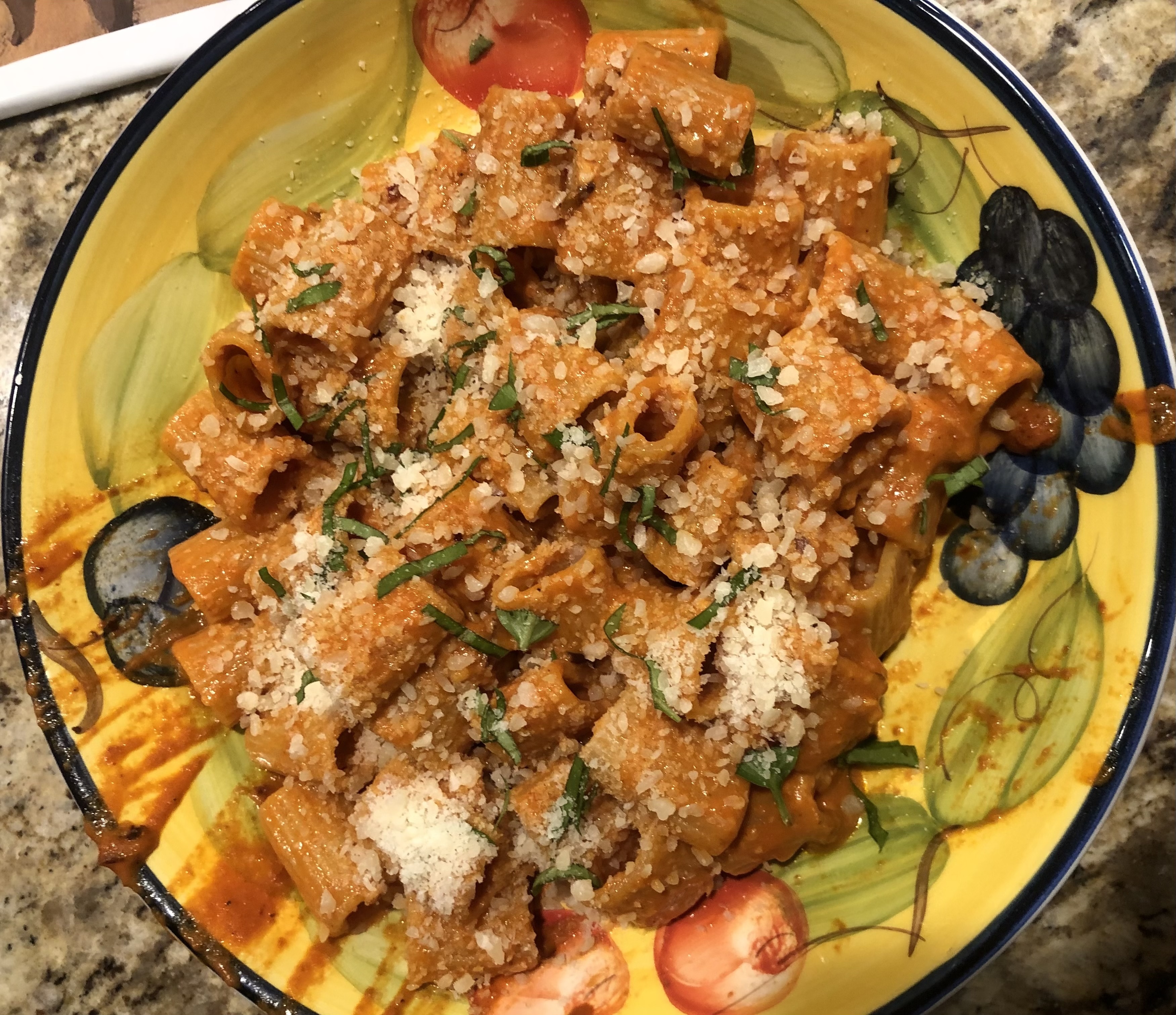 - Cook rigatoni pasta al dente- be sure to save some pasta water.