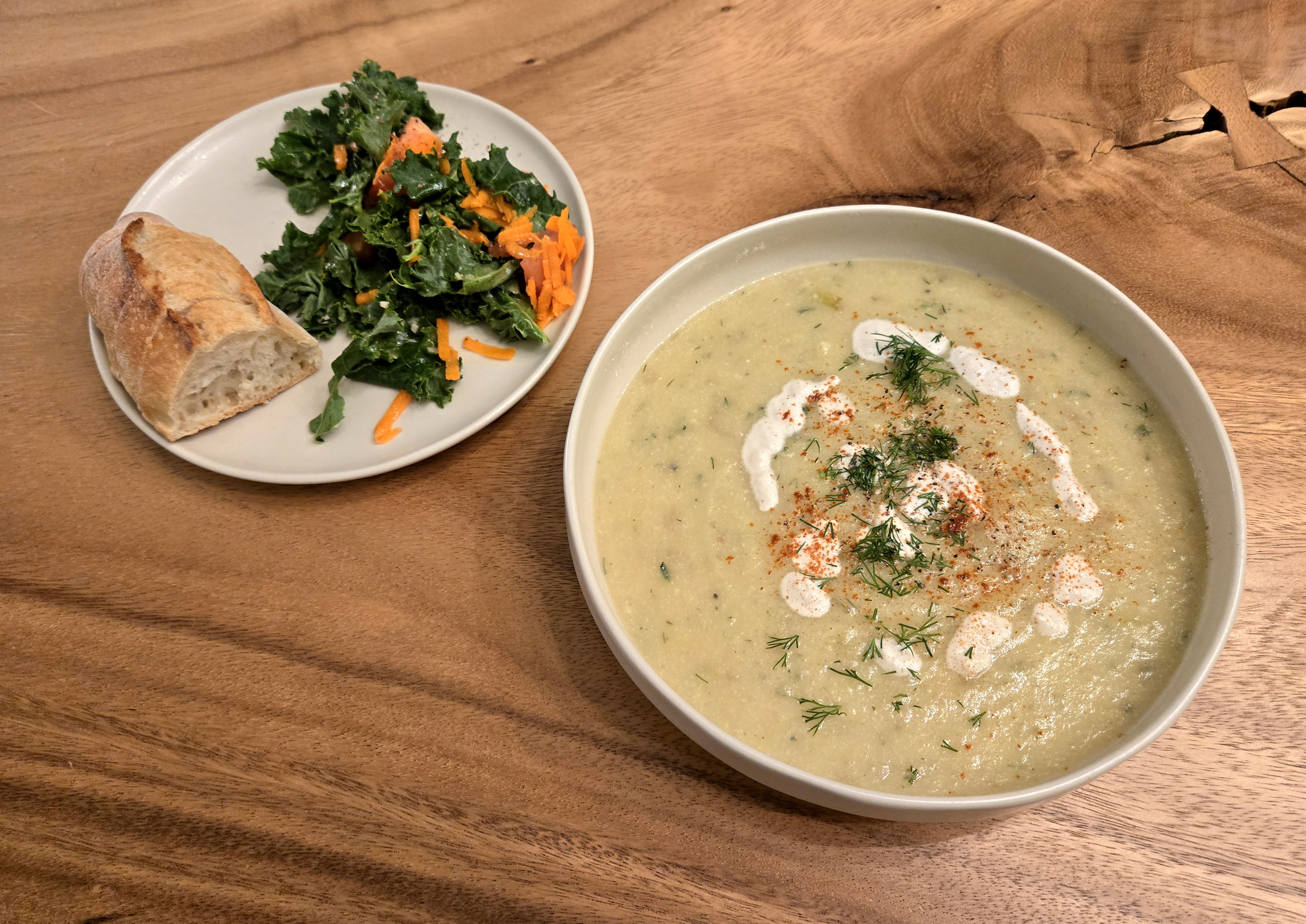 Dish out into a shallow bowl. Add a swizzle of creme in the bowl if you are feeling fancy. Top with more fresh dill, a dusting of paprika, and fresh cracked pepper.